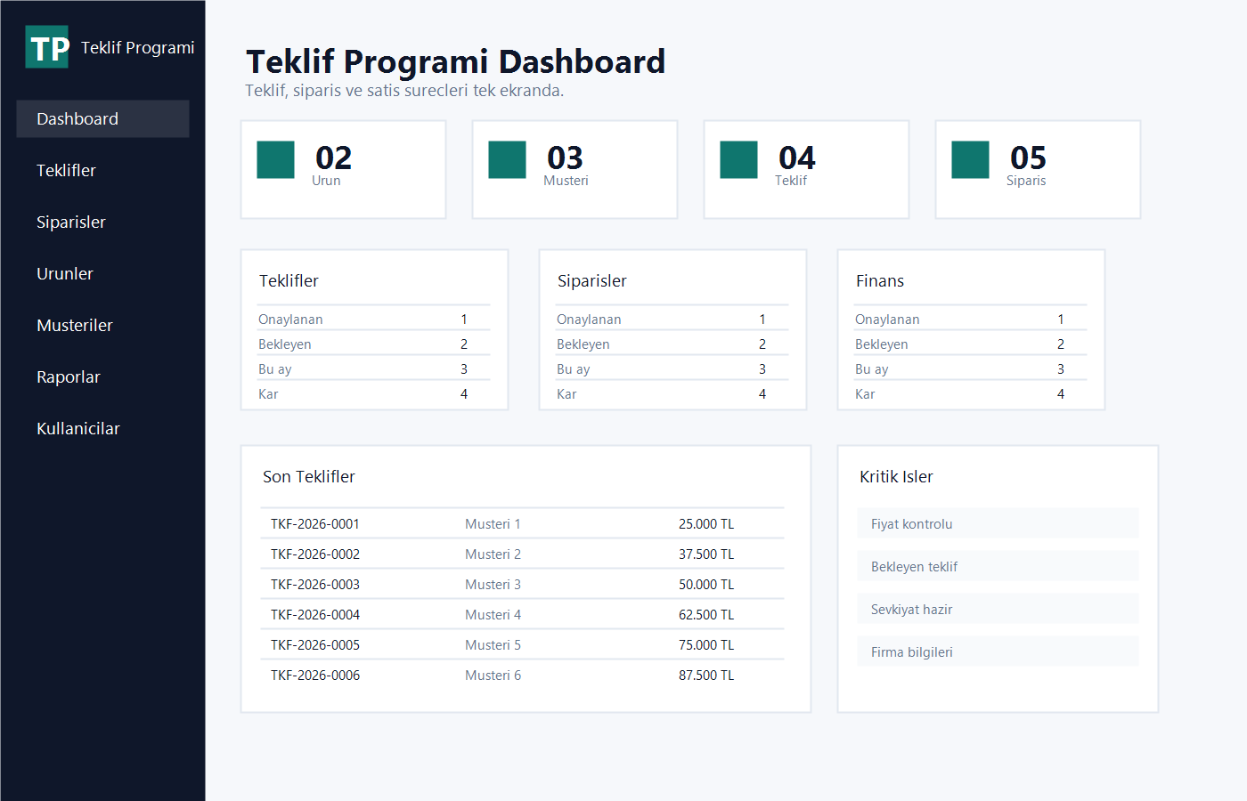 Urun, musteri, teklif, siparis, kar analizi ve kullanici yetkilerini tek programda yonetin.